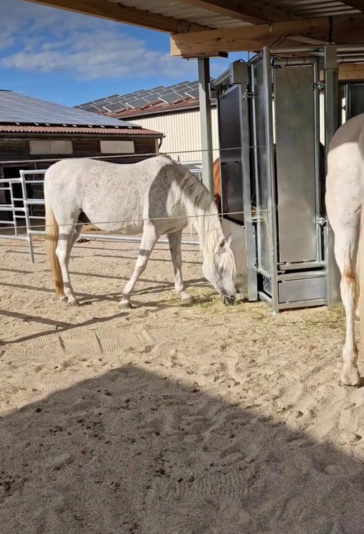Jedes Pferd hat seine eigene Box mit anschließendem Auslauf, der 24h vom Pferd genutzt werden kann. Die Boxen haben ca. 14-16qm und sind mit Sägespäne eingestreut und die angrenzen Paddocks sind ca. 25-50qm groß und teils mit befestigt und teils unbefestigt. Es gibt die Option, dass wir sie im Sommer halsbtags in 2er oder 3er Herden auf die Graskoppeln bringen. Kraftfutter bekommen sie 2x täglich, Heu gibt es morgens eine kleine Portion und abends eine große Portion. Vormittags bekommen sie für den Tag über noch eine Portion Stroh, auf Wunsch auch Stroh und Heu gemischt oder rein Heu, dies ist aufpreispflichtig.